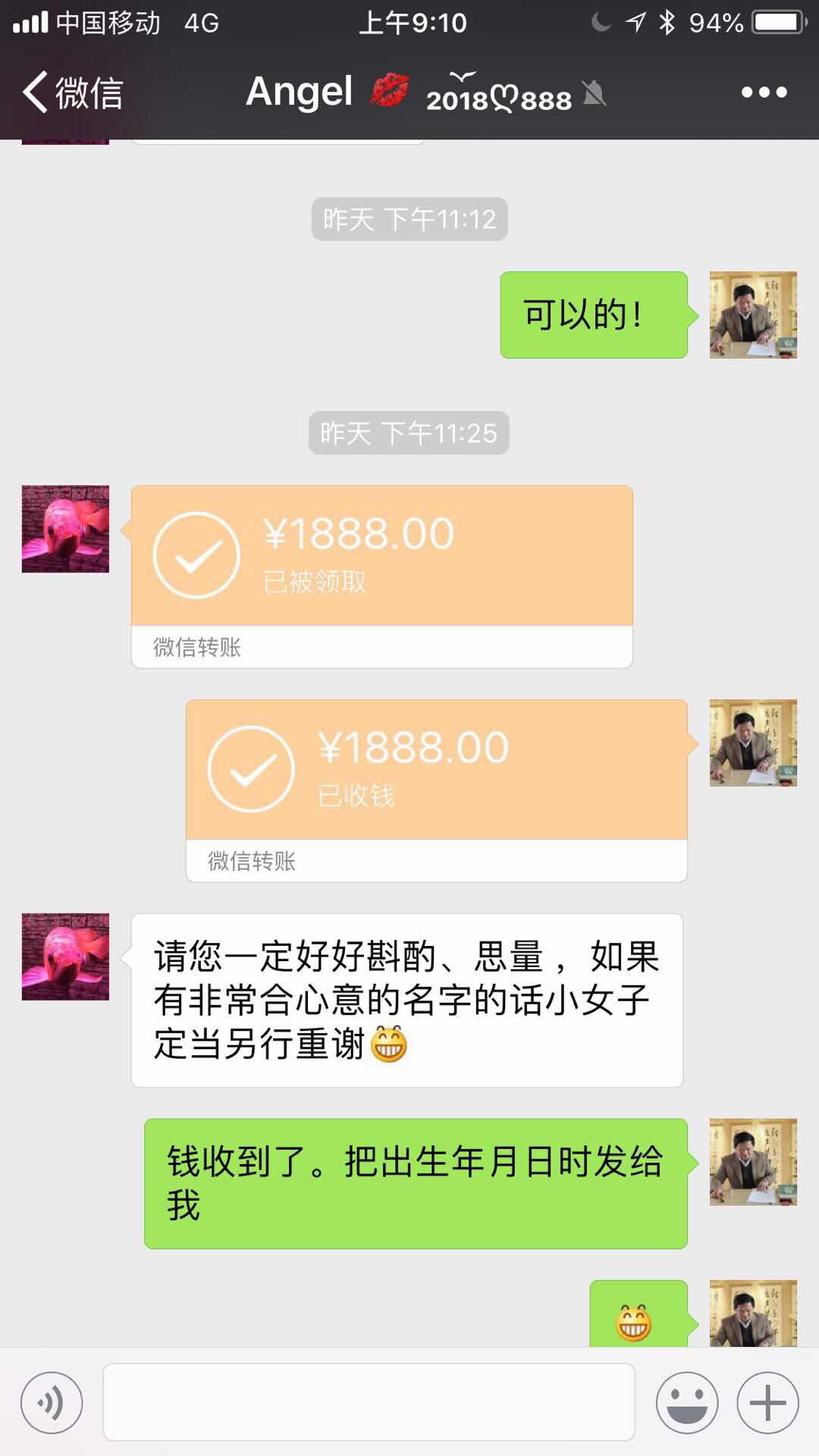 成人改姓名=1888元。天廷起名价格贵,找天廷的却人许多,排队也要请风水大师起个好姓名。这客户之前也找其他师傅起的,她说我是90年代的女人,姓名要时髦,好听好记。最终仍是请徐天廷教师帮自己起个好姓名。天廷起名代表着显贵的标志,一世荣耀,更多人遥不行及的愿望!