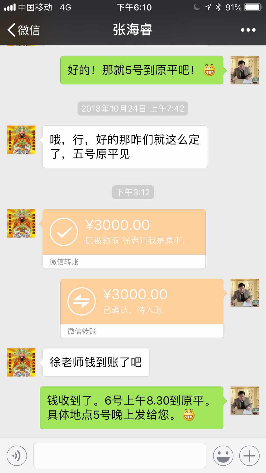 上海风水大师,山西原平看风水9000元,预约支付三分之一订金3000元。客户昨天转了钱,确认收款,待入账,24个小时后到账。这微信真会折腾,还弄出个待入账,计划跟不上变化啊!徐老师还没有闹明白呢,就把机票火车票买了。如果客户在24小时内提出退款,那么徐老师就亏大了。5号坐飞机到太原,6号上午坐动车到原平。然后,7号坐飞机回来。旅途劳顿,挺辛苦的。祝徐天廷老师一路顺利!