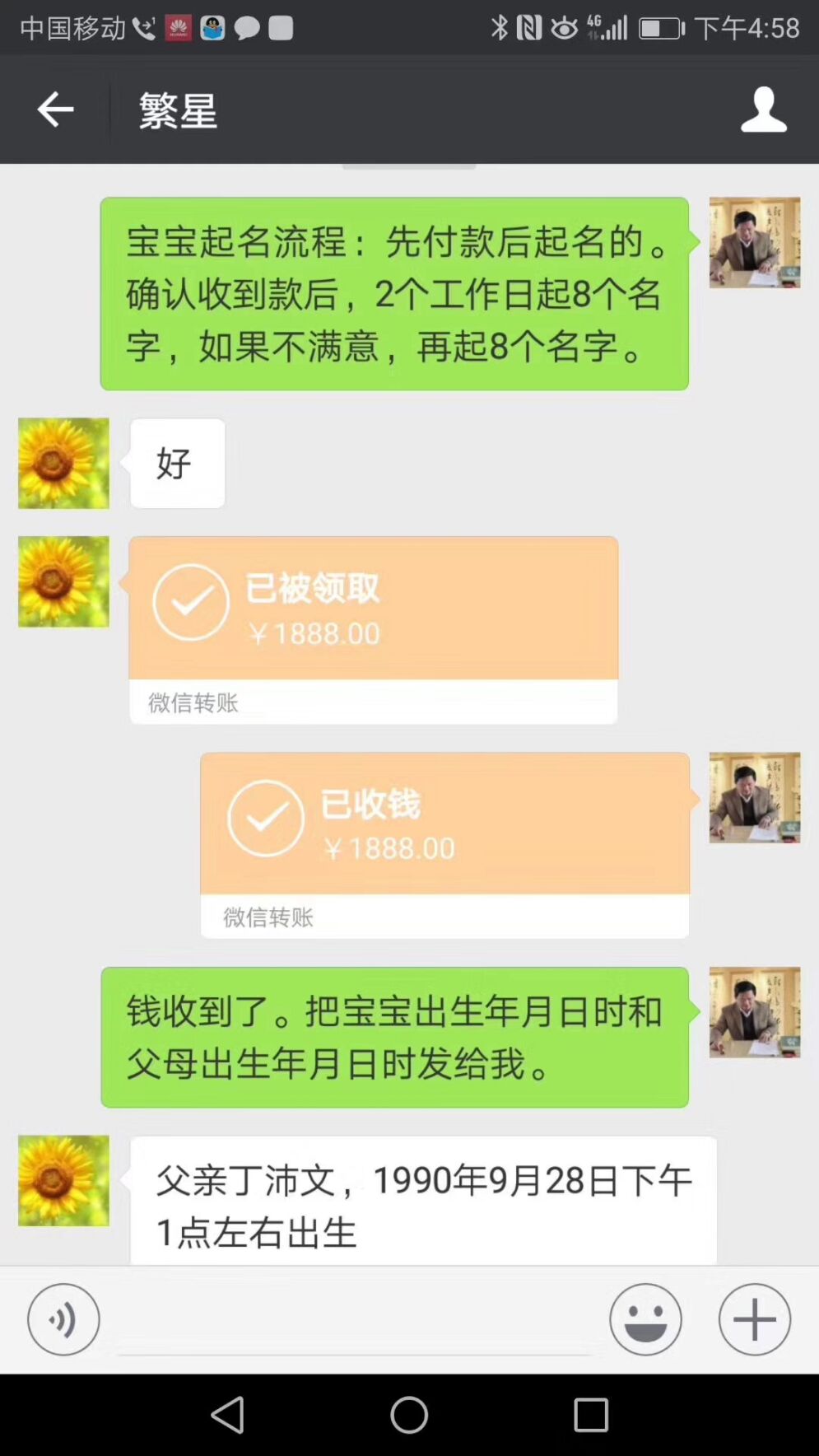 上海风水大师给丁姓家长给宝宝起名字1888元,女孩子,我们是先付款的,确认收到款后,2个工作日起8个名字。找2个名字点评一下。丁怡菲和丁禹涵,从两个名字可以看出宝宝喜用神是土,怡和禹五行属性都是属土,根据宝宝出生年月日时,排出宝宝生辰八字。找出喜用神,然后,在宝宝三个字中必须要跟土对应,符合宝宝五行属性。再根据五格来起名。我们一般要求人格,地格,总格吉祥就可以了。这样来说我们根据姓氏笔画,可以算出每个字吉祥字根。有了字根,我们就能看出几画跟几画搭配,就能够起出吉祥的好名字来了。这就是一个职业起名师傅与家长起名之间的区别。我们更加容易起出好名字。当然,丁怡菲和丁禹涵即符合宝宝生辰八字,同时,又符合五格吉祥。名字又好听,好记,易懂!好名字就这样出炉了。天廷起名代表着尊贵的象征,一世荣耀,更多宝宝遥不可及的梦想!
